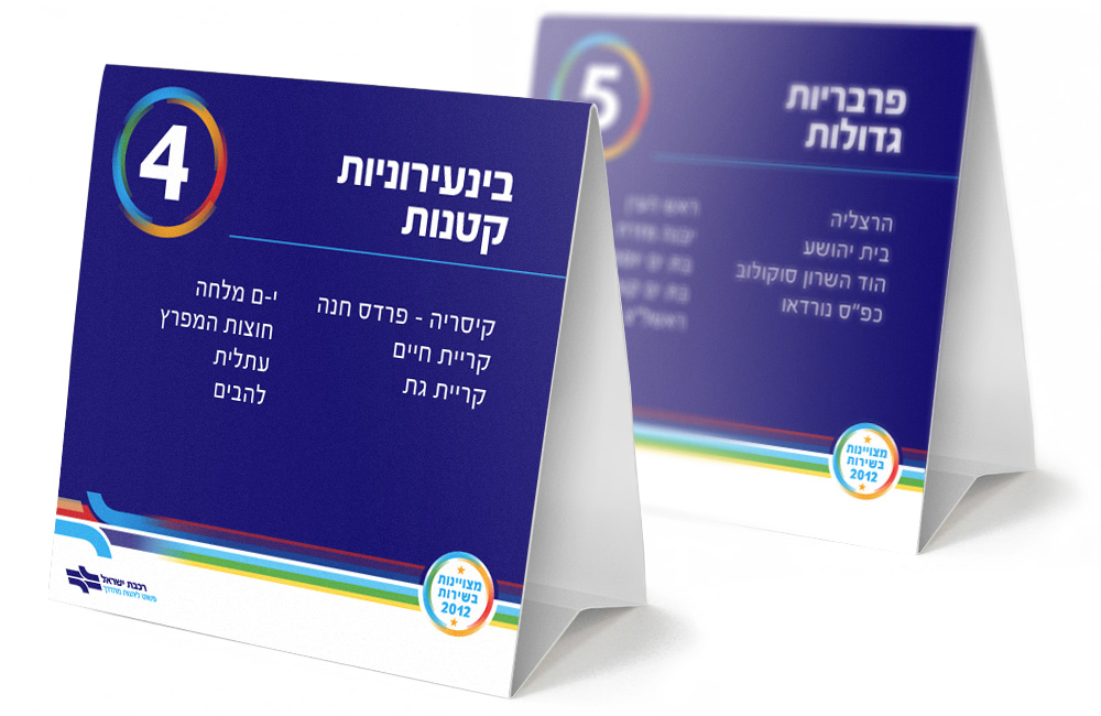 The ‘Service Excellence’ event is an annual event held by Israel railway management to nominate the best service oriented workers and cellebrate excellency. The event’s branding included a logo design, based on the colorful strips of the newly redesigned logo forming a circle, and all of the graphic elements for the event – invitations, certificates, and environmental elements; from a gallery of all station managers with personal pictures, to stage design, signage, banners, rollups, table stands etc.